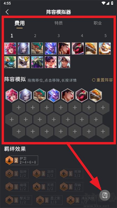 2、可在陣容模擬器中自定義陣容并保存方案;