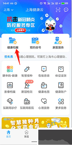 1、打開健康云APP,點(diǎn)擊“首頁”-“健康檔案”;