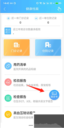 2、進(jìn)入健康檔案頁面,點(diǎn)擊右下角的“就診卡”選項(xiàng);