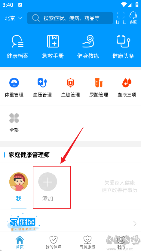 1、打開智慧E保App進入到用戶首頁,點擊家庭管理師選項下方的“添加”按鈕;