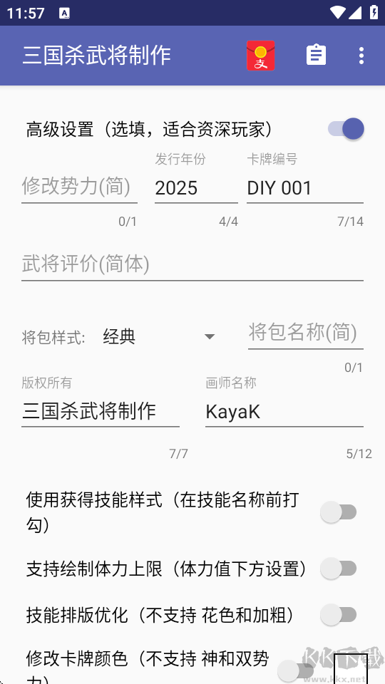 三國殺武將制作器是一款專為設計愛好者推出的DIY工具,支持用戶創(chuàng)作個性化三國殺武將卡牌。應用界面清晰直觀,可以自由設定武將所屬勢力、頭像、名稱、技能及卡面風格,并提供多種跨陣營模板選項,如蜀吳、魏群等組合。你可以在現(xiàn)有模板上調整,也能完全從零開始設計全新武將。