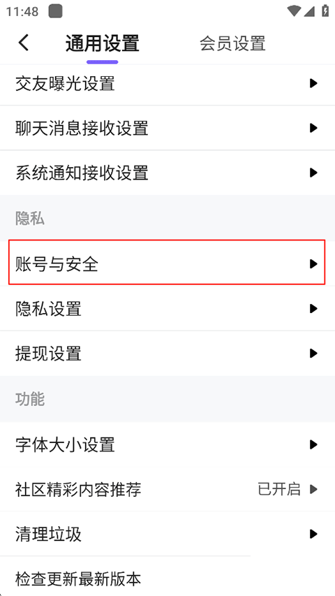 2、在通用設(shè)置頁面下滑找到賬號與安全;