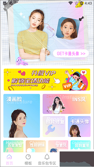 1、下載安裝后進(jìn)入首頁,可以看到漫畫臉、INS風(fēng)、照片修復(fù)、卡通頭像等很多種修圖選項;