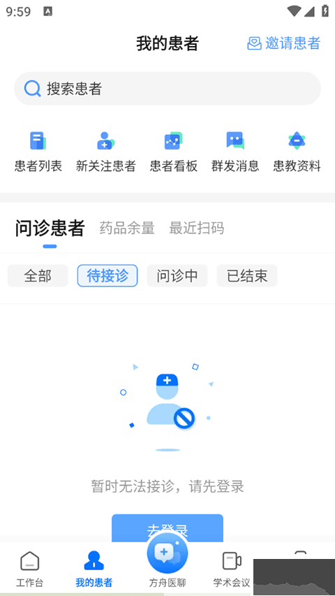 1、打開健客醫(yī)院,先注冊(cè)/登錄賬號(hào),在工作臺(tái)頁面點(diǎn)擊邀請(qǐng)患者,患者通過掃描醫(yī)生出示的二維碼可加入到醫(yī)生旗下。