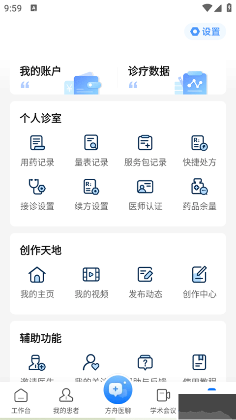 3、最后在個(gè)人中心頁面提供了個(gè)人診室、創(chuàng)作天地以及輔助功能等眾多功能服務(wù)內(nèi)容。