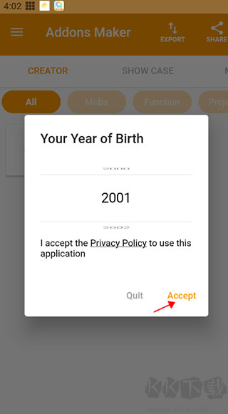 1、啟動我的世界mod制作器,選定出生日期并點(diǎn)按同意。