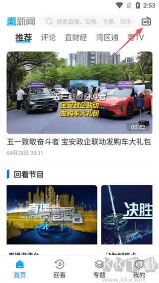 1、打開直新聞App,點(diǎn)擊右上角的【收音機(jī)圖標(biāo)】