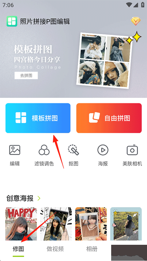 1、打開照片拼接P圖編輯APP,在修圖功能頁點(diǎn)擊模板拼圖;