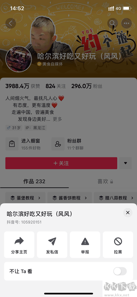 1、首先可在抖音內(nèi)添加播主至關(guān)注列表,常規(guī)方式為進(jìn)入播主個(gè)人頁面,選擇“關(guān)注”按鈕,或點(diǎn)擊個(gè)人頁右上角菜單打開分享頁面完成操作。