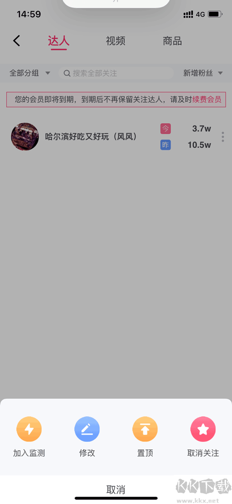 3、停止對(duì)播主的資料監(jiān)測(cè),采用相同步驟,在灰豚應(yīng)用主界面的關(guān)注名錄中,選擇更多選項(xiàng),于豎排菜單內(nèi)取消關(guān)注即可。