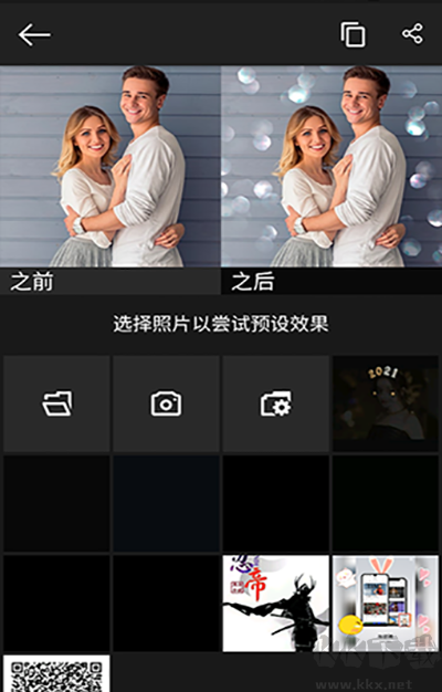 2、點(diǎn)擊一種特效,這兒就能看到模板之后的效果,并在此選擇照片以嘗試預(yù)設(shè)效果;