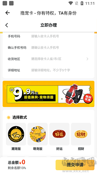 3、填寫個(gè)人信息,選擇款式,接著點(diǎn)擊【提交申請】,之后請耐心等待接收快遞。