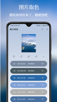 3、直接列出圖片中的主要顏色供您挑選,也可以單獨(dú)獲取任意點(diǎn)顏色,還可以生成分享色卡
