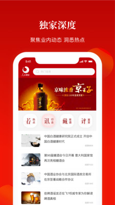 酒業(yè)資訊、品酒薦酒的酒業(yè)綜合平臺,主要實現(xiàn)“酒業(yè)資訊”、“酒業(yè)活動”兩大功能,提供中國權威專業(yè)的酒品行業(yè)酒企數(shù)據(jù)庫、酒業(yè)專家數(shù)據(jù)庫、行業(yè)資訊數(shù)據(jù)庫、和知名經銷商數(shù)據(jù)庫等綜合服務的客戶端!