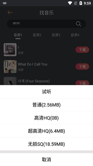 6、在喜歡的音樂后點(diǎn)擊下載,可在線試聽也可使用無損下載;