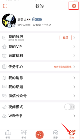 1、首先進(jìn)入主頁(yè)面,點(diǎn)擊右下角“我的”選項(xiàng),進(jìn)入個(gè)人頁(yè)面里選擇右上角設(shè)置功能。