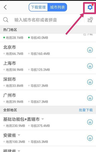 5、下載離線地圖完成后,點(diǎn)右上角的設(shè)置小圖標(biāo)(見圖)。