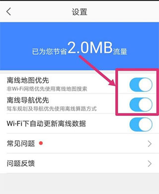 6、進(jìn)入設(shè)置界面后,把“離線地圖優(yōu)先”和“離線導(dǎo)航優(yōu)先”按鈕打開,設(shè)置成功后就可以離線導(dǎo)航了。