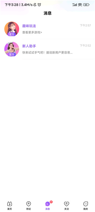 5、點(diǎn)擊消息,這里有新人助手給新用戶發(fā)來的通知信息,之后和主播的聊天也可以在這里找到;
