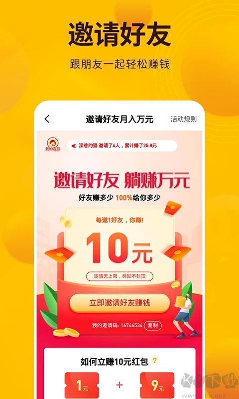 4、邀請好友一起加入每天賺點,通過專屬收徒鏈接,瞬間俘獲大批徒弟,好友和你都可獲得現(xiàn)金獎勵,追高可獲得1000+現(xiàn)金獎勵,趕快加入每天賺點