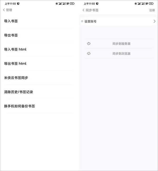 最后說下書簽功能吧,支持導(dǎo)入你之前瀏覽器的書簽,支持 html 的格式書簽文件。如果你需要書簽同步功能,可以通過注冊米俠同步賬號。
