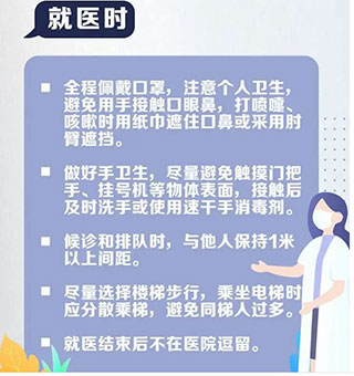 做好手衛(wèi)生,盡量避免觸摸門把手、掛號(hào)機(jī)等物體表面,接觸后及時(shí)洗手或使用速干手消毒劑。