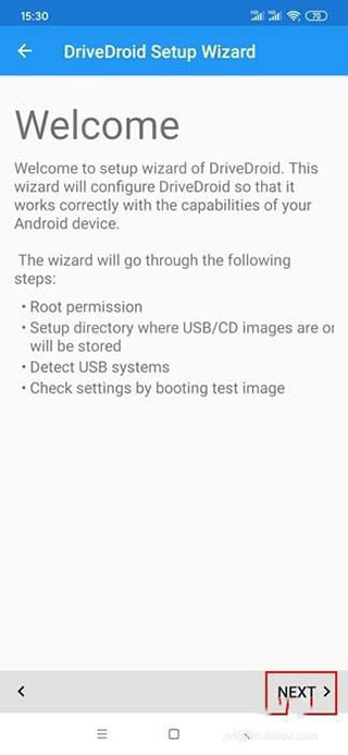 2、歡迎使用Drivedroid安裝向?qū)В鞠驅(qū)⑼ㄟ^(guò)對(duì)Drivedroid進(jìn)行設(shè)置,以保證軟件與你的安卓手機(jī)兼容并正確運(yùn)行。此項(xiàng)導(dǎo)涉及以下幾個(gè)步驟:ROOT權(quán)限的獲取