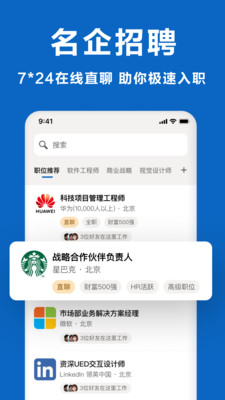 Linkedin領(lǐng)英職場名企招聘,海量高薪職位實時更新,高效求職,多個職位一鍵申請,在線直聊,有效溝通助你事半功倍!