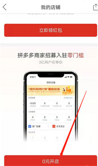 3、在我的店鋪界面,點(diǎn)擊“0元開(kāi)店”;