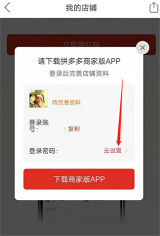 4、然后彈出的一個(gè)窗口“下載拼多多商家版app”,此時(shí)可以先設(shè)置密碼點(diǎn)擊“去設(shè)置”;