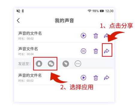 2、選擇語音包或者錄制好的聲音,點擊右邊分享按鈕。