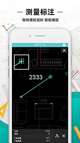 畫(huà)直線(xiàn)協(xié)助測(cè)量。平行線(xiàn)可以被測(cè)量,與原圖紙線(xiàn)框交叉造成相交點(diǎn),也可以捕獲