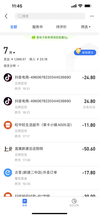 2、我們點(diǎn)擊了賬單的功能之后,我們先找到自己需要?jiǎng)h除的交易記錄,然后我們向左滑動(dòng)這個(gè)頁(yè)面。