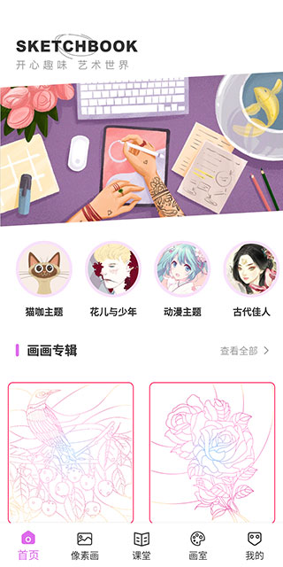 1、進(jìn)入軟件之后,我們可以點擊首頁上方的主題或者下方的查看全部按鈕來查找自己喜歡的畫作。
