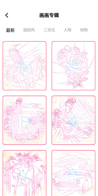 2、在畫畫專輯界面,每個畫作都被分為了不同的類別,用戶可以點擊上方按鈕進(jìn)行切換。
