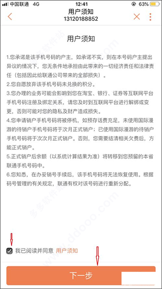 3、之后是銷戶合同的一堆注意事項吧啦吧啦,選擇已經(jīng)閱讀并同意,接著下一步。