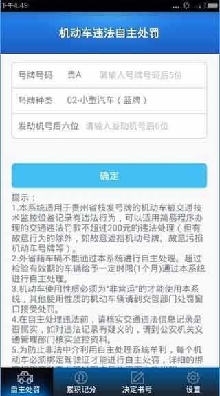 1、下載“貴州交警app官方最新版2023”,打開app,在自主處罰界面,你可以對您的機(jī)動車違法自主處罰的呦;