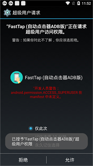 1、下載并打開(kāi)自動(dòng)點(diǎn)擊器APP,進(jìn)入軟件先授權(quán)手機(jī)超級(jí)用戶權(quán)限。