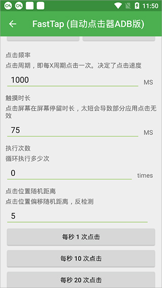 3、在設(shè)置界面可以設(shè)置點(diǎn)擊頻率、點(diǎn)擊時(shí)長(zhǎng)、執(zhí)行次數(shù)、點(diǎn)擊隨機(jī)位置,如果不知道如何設(shè)置數(shù)值,可以下滑界面有開(kāi)發(fā)者設(shè)置好的數(shù)值選項(xiàng),點(diǎn)擊選項(xiàng)即可自動(dòng)填充數(shù)值。