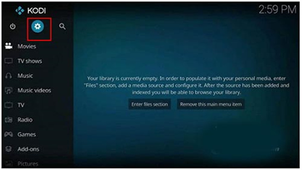 1、打開(kāi)kodi播放器手機(jī)版,進(jìn)入主界面后選擇左上方中間的齒輪。