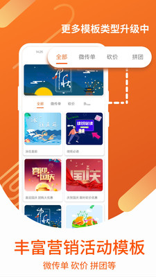 1、支持多種活動模板:微傳單、砍價、拼團(tuán)等,更多活動模板升級中...