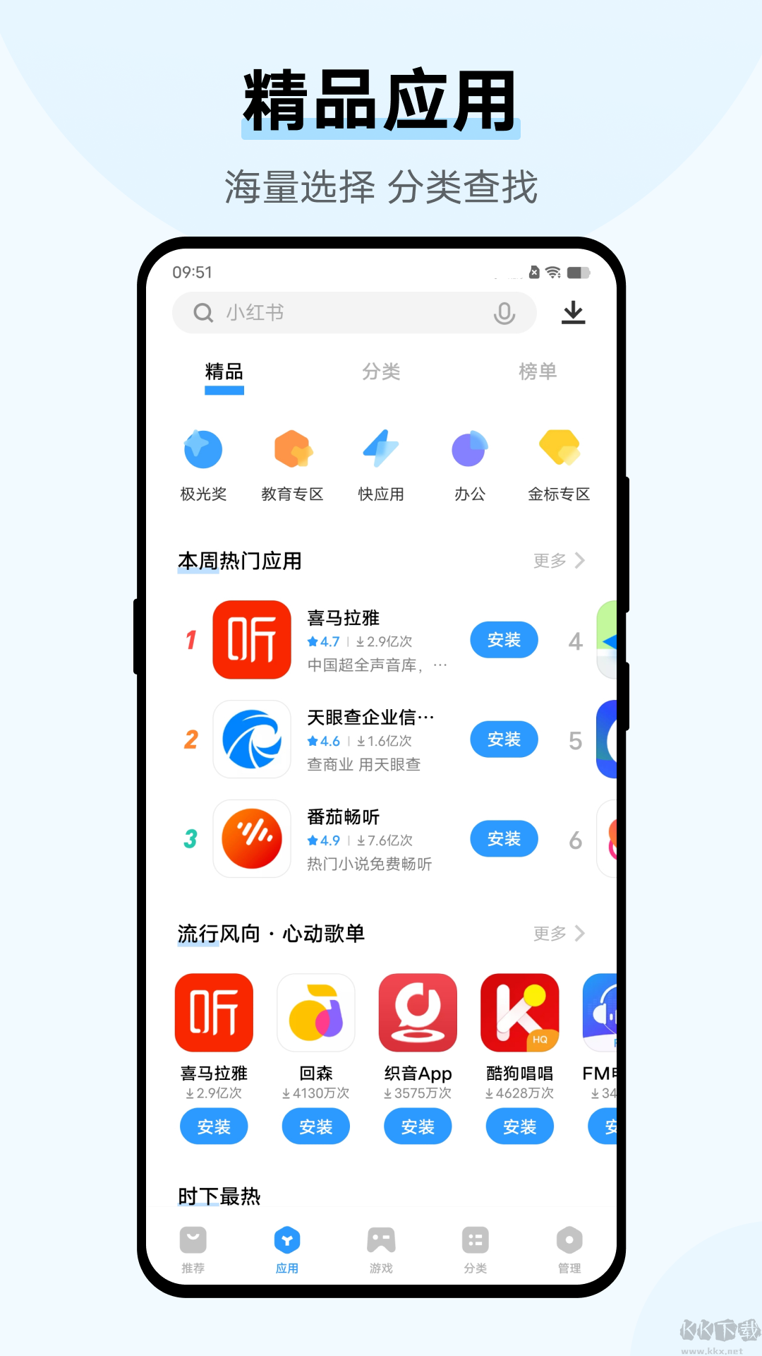 3. 應用分類:商店中的應用程序按照不同的分類進行展示,例如熱門應用、新應用、精品應用、游戲、工具等。