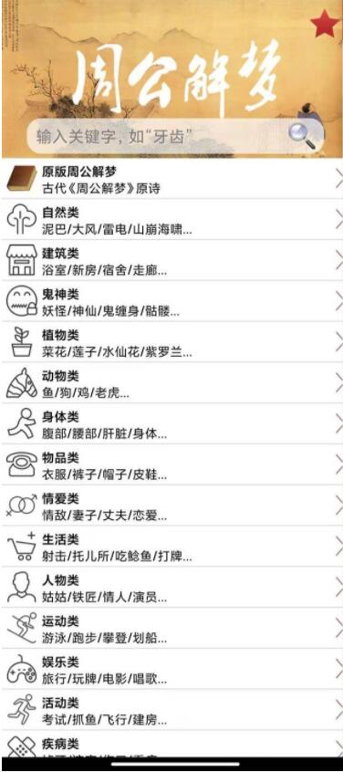 2、分類搜索功能,如人物解夢、動物解夢、植物解夢、物品解夢、活動解夢、生活解夢、自然解夢、鬼神解夢、建筑解夢、孕婦解夢、其他類別解夢