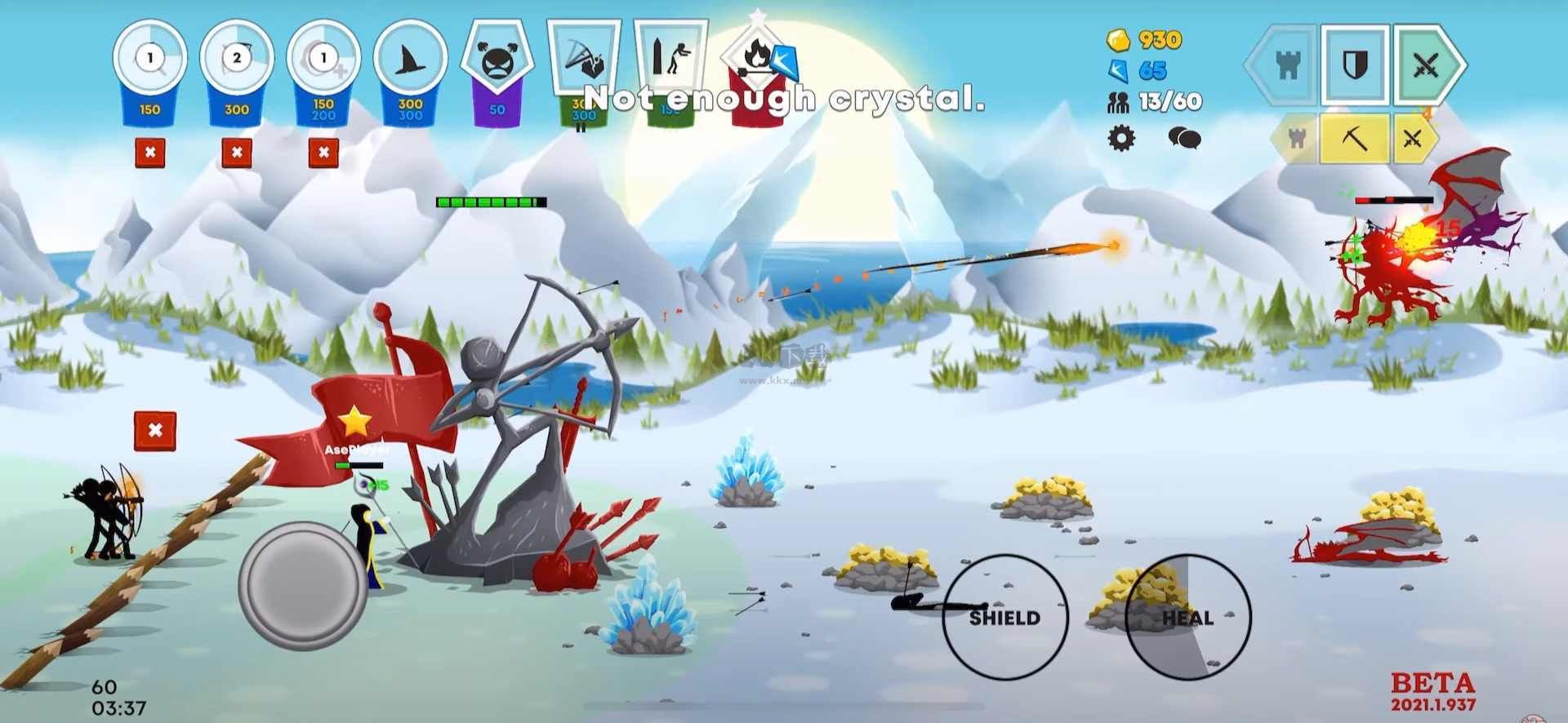 4、弓箭手成型后非常好壓制電腦,所以有個(gè)技巧可以不讓電腦農(nóng)民采礦:將屏幕滑到電腦的城堡弓箭手那里,然后進(jìn)攻,電腦都會撤兵,所以只需要看電腦的城堡弓箭手什么時(shí)候發(fā)箭,他攻擊就防御,他出來就攻擊。這樣可以完全不讓電腦有經(jīng)濟(jì),所以這時(shí)我們只需要等兵多了然后一波了