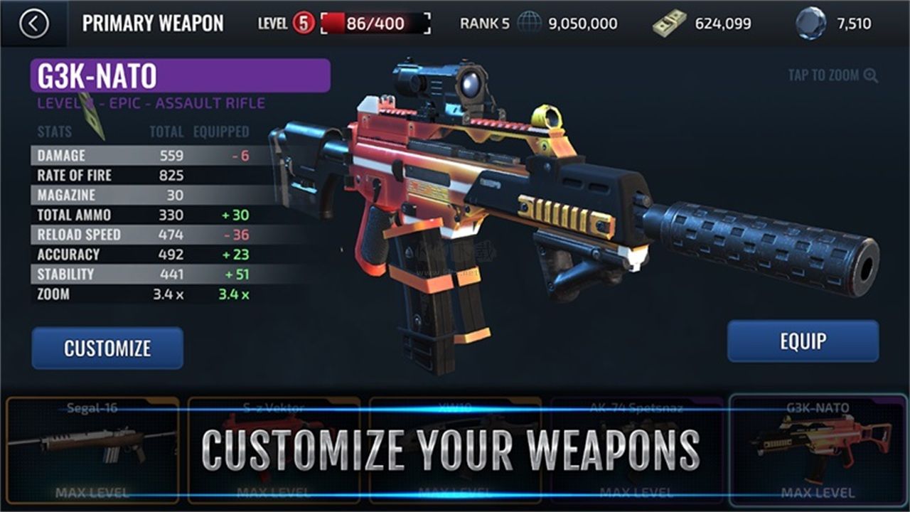 武器可以完全定制:你可以改變武器的顏色、槍管、槍托和瞄準鏡!