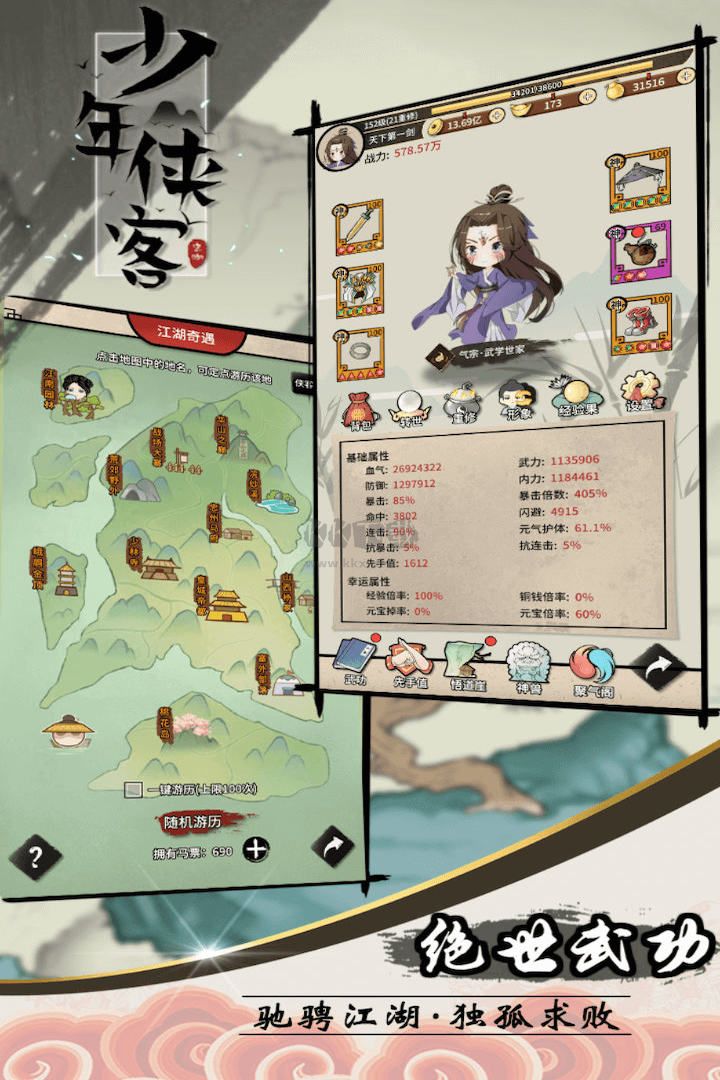 少年俠客行游戲是一款武俠題材的放置掛機手游,核心玩法是以武功套路為基礎,玩家將通過挑戰(zhàn)各路宗師,來提升自己在江湖上的經驗和歷練,玩家還可以拜訪各大門派的宗師,從中學習該門派下的絕世神功,為以后挑戰(zhàn)各大武林高手奠定一定的武功基礎,而玩家則是要開啟這經典的武俠江湖。玩家將以小蝦米的身份進入江湖,你可以跟隨主角前往不同的關卡中進行挑戰(zhàn),把戰(zhàn)斗等級提升至一定的層次,便可挑戰(zhàn)宗師,從而進一步提升江湖地位。在少年俠客行手游中,不僅有著傳統(tǒng)RPG游戲的收集養(yǎng)成玩法,還有著極具挑戰(zhàn)性的武林大會,更是收錄著經典武俠中的108門武功絕學,可謂是非常的豐富。