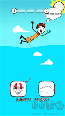 2、點(diǎn)擊屏幕,會(huì)出現(xiàn)相應(yīng)的道具解決當(dāng)前的狀態(tài),不同的道具選擇過后結(jié)局會(huì)不一樣,選擇左邊的降落傘,云會(huì)被風(fēng)吹散。