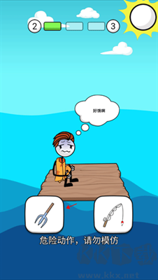 7、火柴人喝足之后,又開始餓了,需要吃東西,用叉子可以將魚弄上來,如果選擇釣魚竿的話很有可能會(huì)釣到鯊魚,非常危險(xiǎn)。