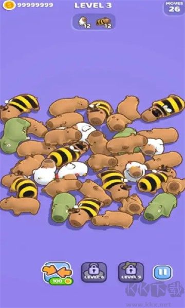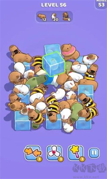 1、拖動(dòng)屏幕上的水豚進(jìn)行匹配,三個(gè)或以上相同的水豚即可合并升級(jí)。