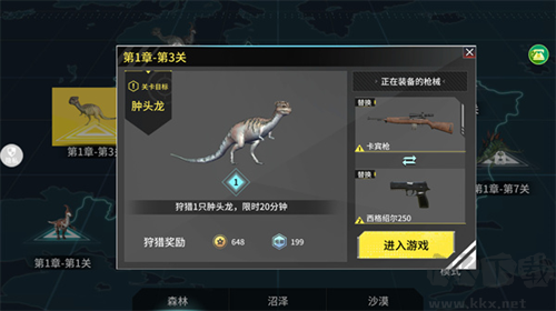 2、武器庫(kù)槍械種類豐富,各種殺傷力的槍隨你挑,根據(jù)恐龍的攻擊力選擇合適的槍支,展現(xiàn)獵人的天賦。